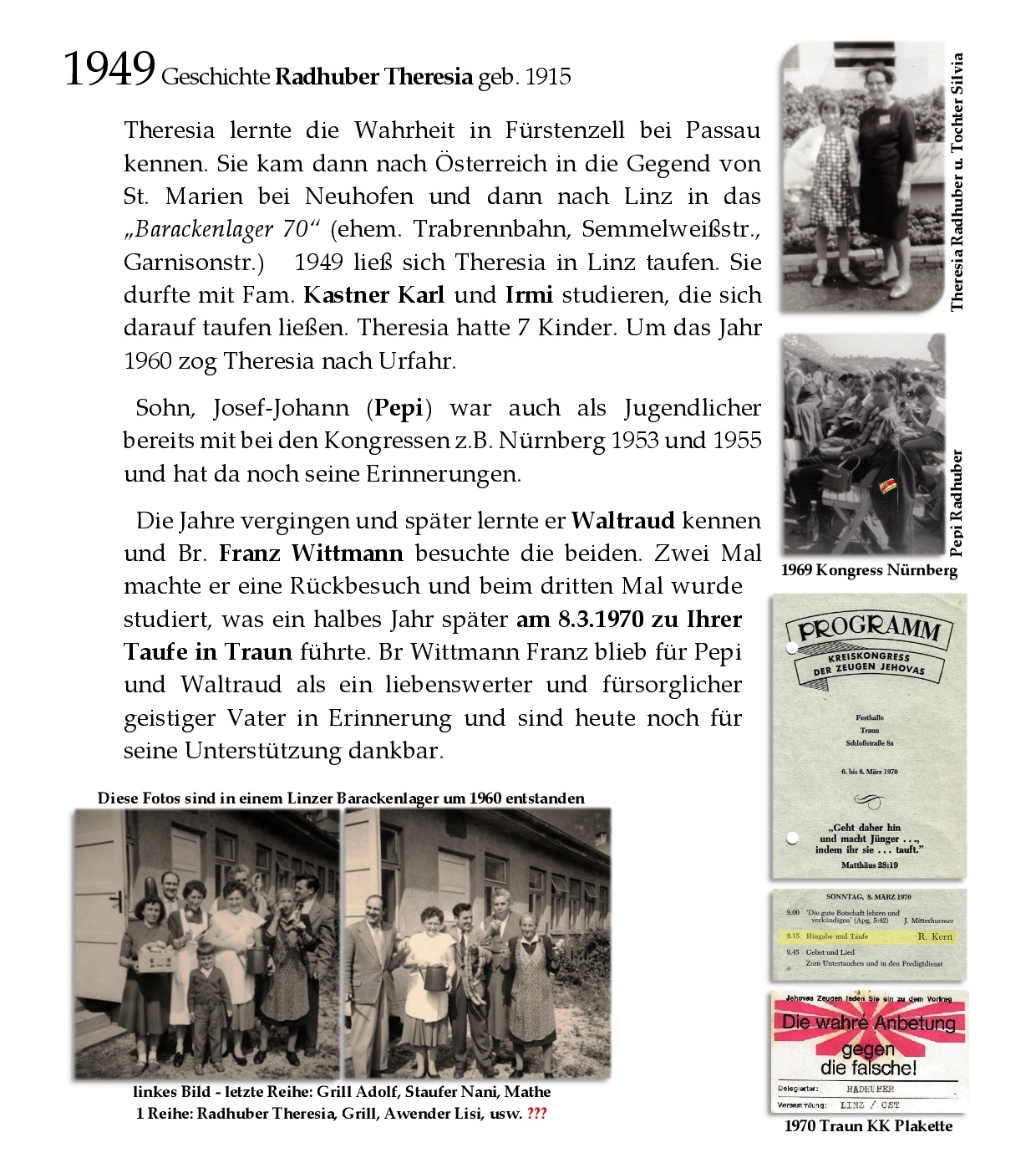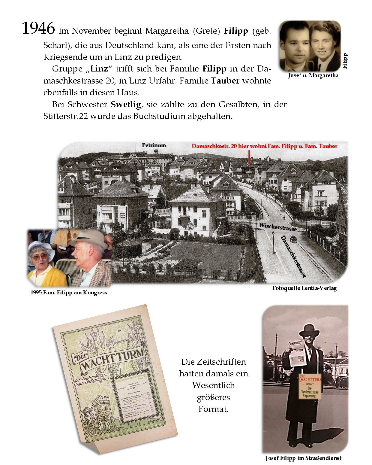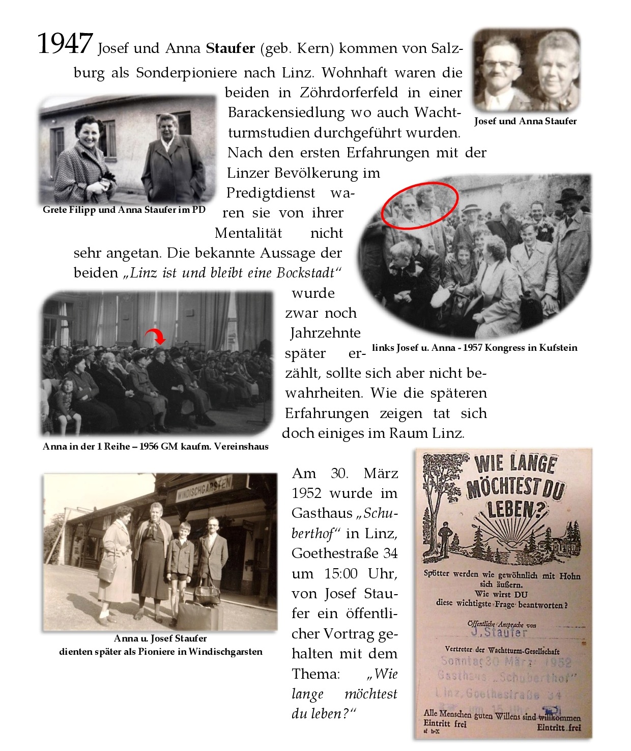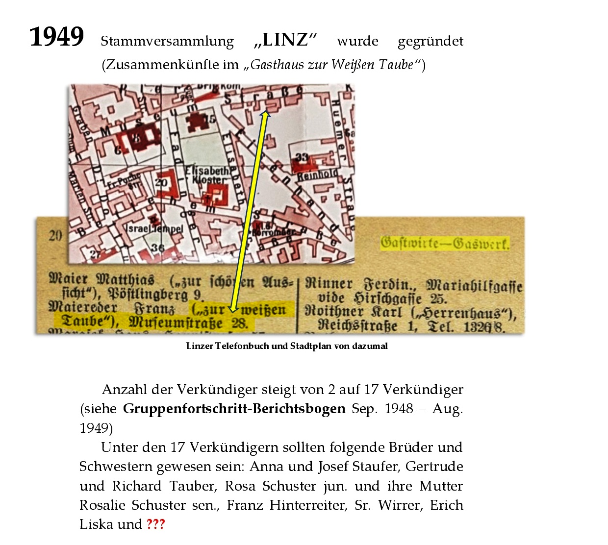 Überblick 1945-1949 Familien und besondere Ereignisse: Schuster, Filipp, Tauber, Hinterreiter, Mühleder, Staufer, Gesellschafts-Gründung, Erstes-Abendmahl-Linz, 1948 Bethel, Dienst-Gruppe-Bahnhof-1948, Liska, Pöschl, Gründung-Versammlung-Linz, Vortrag-Hotel-Reiter, Radhuber,